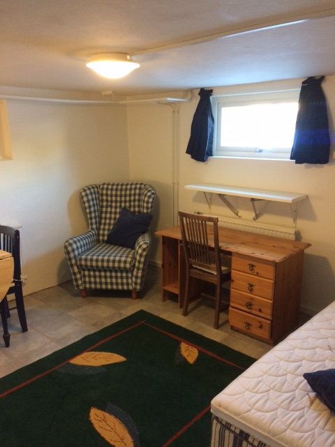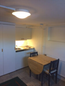 Lägenheten, 1 rum och kokvrå, ligger i källarplanet och har egen ingång.