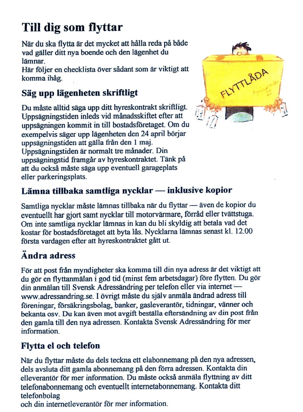 - Glöm inte avbeställa eventuellt bredbandsabonnemang knutet telefonjack eller fiberbredbands uttag. I annat fall blockeras nästa hyresgäst.