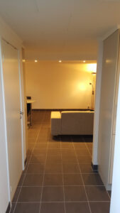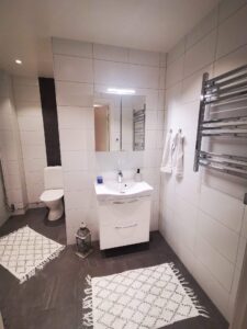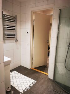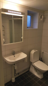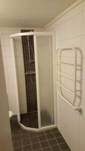 På 3:e våningen en elegant lägenhet, 26 kvm, med helkaklat duschrum.